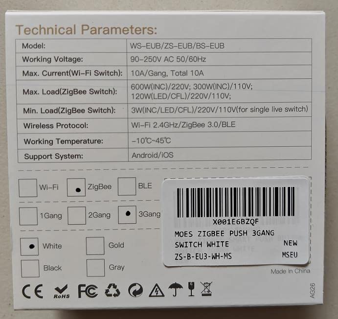 I bought this switch to replace a 2-gang switch in my hallway which had one integrated time and light sensitive controlled gang being used to automatically switch an outside porch light. The old switch was unable to control LED bulbs so was effectively obsolete.I expected to control the new switch from my Amazon Echo Dot (5th Gen) speaker.It was easy to install the new switch in place of the existing switch and confirm that it could function as a dumb switch turning the two connected lights on and off via the switches. The little blue LED on each switch is lit when the respective light is on.The switch unit as a whole is put into pairing mode by holding down either physical switch until the left hand LED blinks. But I was not able to get my Echo Dot to “discover” the switch. Further web research eventually uncovered that although Amazon introduced integrated ZigBee hubs in the 4th and 5th generation Echo speakers, they did NOT put them in the Echo Dot. So I purchased a Moes ZigBee Gateway.I also purchased a Schneider Electric spacer ring because the Moes switch needs a deep (35mm) backing box and my existing fitting had a standard 28mm backing box.The Moes hub is a tiny box of minimalist design with a single reset switch and two LEDs. You need to download the SmartLife app to your mobile to set up the hub. This Gateway uses a 2.4GHz wireless channel to connect to your home router and you need to connect your mobile with the SmartLife app installed to the same 2.4GHz channel on your router when setting up the Gateway . Once I did that, setup proceeded smoothly, the Gateway was automatically discovered and updated with the latest software from the internet. When setup is complete, the phone can be put back on the 5Ghz wireless channel, if that is the normal one used.Even with the Gateway setup, it was still not possible to get the switch to be recognised. I tried moving the Gateway to the same room as the switch but with no luck. Eventually I disconnected the switch and wired one gang into the light switch in the same room as the router and the gateway. Once all the power was back on and the switch put into pairing mode, the Gateway immediately detected it and registered the device. After yet another round of switching off the power, moving the light switch back to the intended location in the hallway and reconnecting the power, the switch was still visible and controllable in the App.It proved a bit of fiddle to install the switch neatly. The faceplate screws provided in the box are not the correct size for UK backing boxes but luckily I had some spare ones. Also the Schneider ring is not quite the same faceplate profile as the swich so the two do not fit seamlessly one on the other. I intend to fit a 35mm backing box and ditch the spacing ring once I’ve psyched myself up for some chiselling…Overall I am very pleased with the combination of Moes switch and Gateway coupled with Alexa and the Echo Dot speaker. • I can use Alexa to switch either light on and off by voice command • I can ask Alexa to tell me whether either light is on or off – an added bonus I did not expect • I have set up routines to switch the outside light on just after sunset and off just before sunriseAssuming the gateway and switch work reliably long term, I will be very happy. I expect to install two more of these switches for other locations around the house.