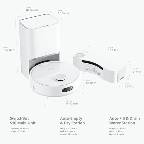 About this item 100% Automated Cleaning: SwitchBot S10 robot vacuum cleaner with mop uses a Dual Station Design to make cleaning truly hands-free. It features a never before seen Water Station that directly connects to household plumbing systems, eliminating the need for manual water refilling or draining. Once it completes a cleaning schedule, it returns to the self-empty station for hot air drying and dust collection for up to 70 days. Simply set it and forget it! Unique Water Station: To make S10 robotic vacuum 100% automated, we created a Auto-Refill and Drain Water Station designed to be compact and can be used without the need for cables, making it easy to place in places with plumbing systems such as kitchens or laundry rooms. We provide a variety of retrofit accessories to easily adapt to existing water pipes or faucets, and installation only takes a few minutes. Self-Mop-Washing On the Go: The robot hoover and mop cleans your home and self-washes its mop at the same time thanks to our RevoRoll Roller Mop design and RinseSync. Our roller mop uses 10N worth of pressure to efficiently remove stubborn dirt and can avoid damaging flooring too. RinseSync enables its Roller Mop to self-washing in real time, making sure it doesn’t spread dirt around the home. 6500Pa Powerful Suction Power: Suitable for removing hair and is an ideal choice for pet families. Multiple cleaning modes can adapt to full coverage of your home. When encountering carpets, S10 robot mop can also automatically lift its roller mop up and enhance suction power, ensuring that no blind spots are missed. Multiple Ways to Control: S10 robot vacuum supports Alexa and Google Home, using voice commands to make cleaning easier. You can customize cleaning and schedules using our app. An even set up restricted areas and virtual walls, with rich features at your fingertips. This device is also part of SwitchBot Ecosystem and you can link products together for even more home automation.